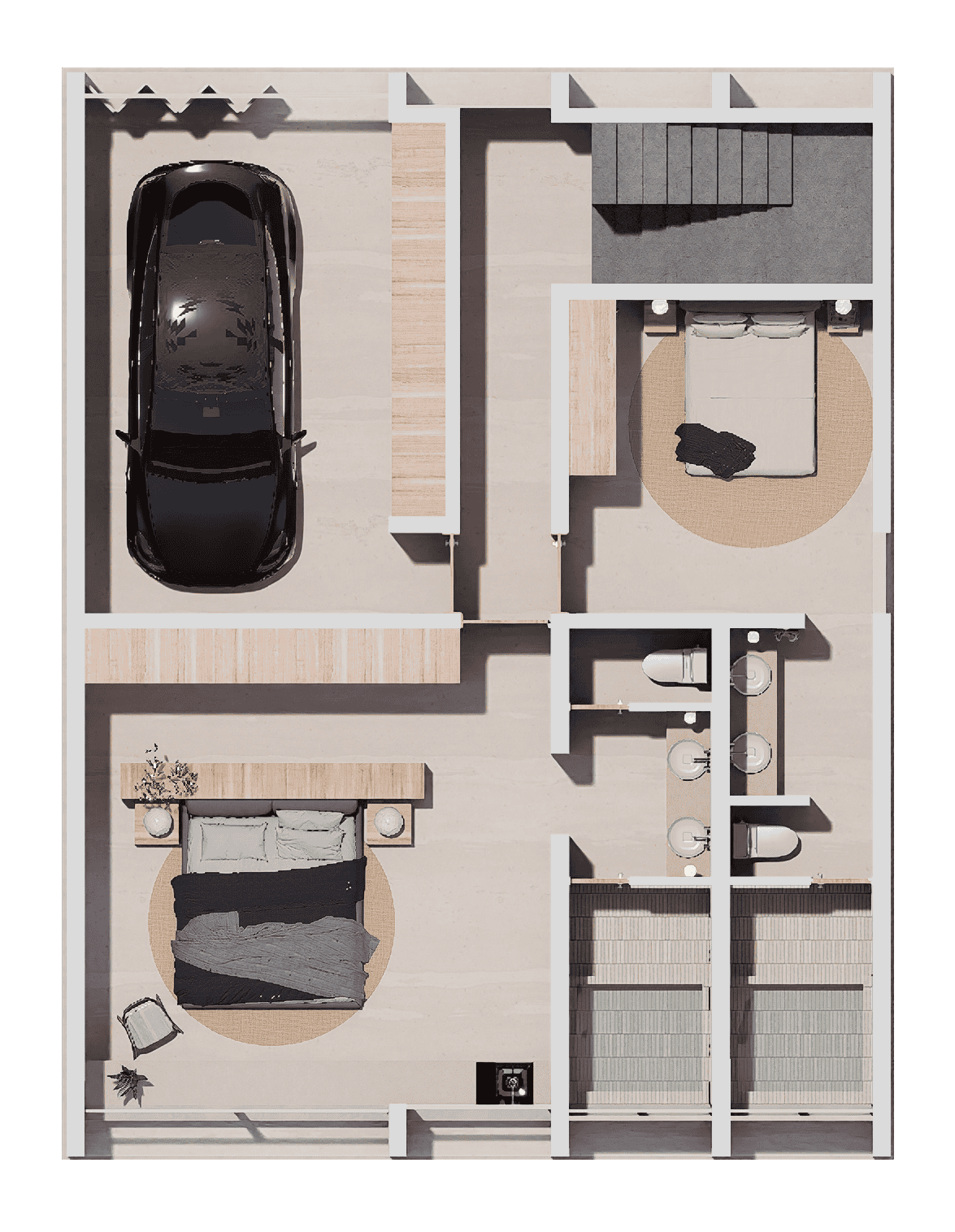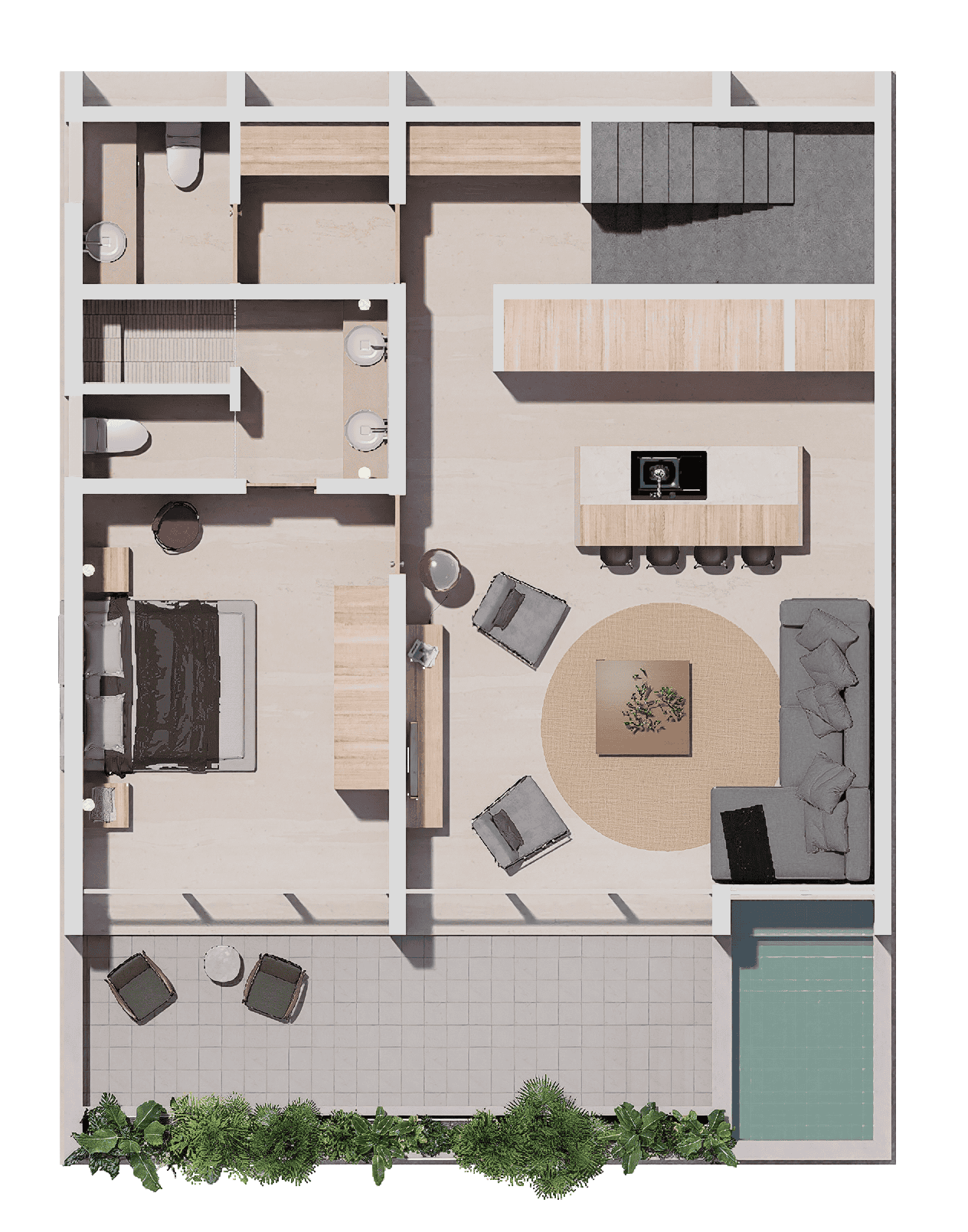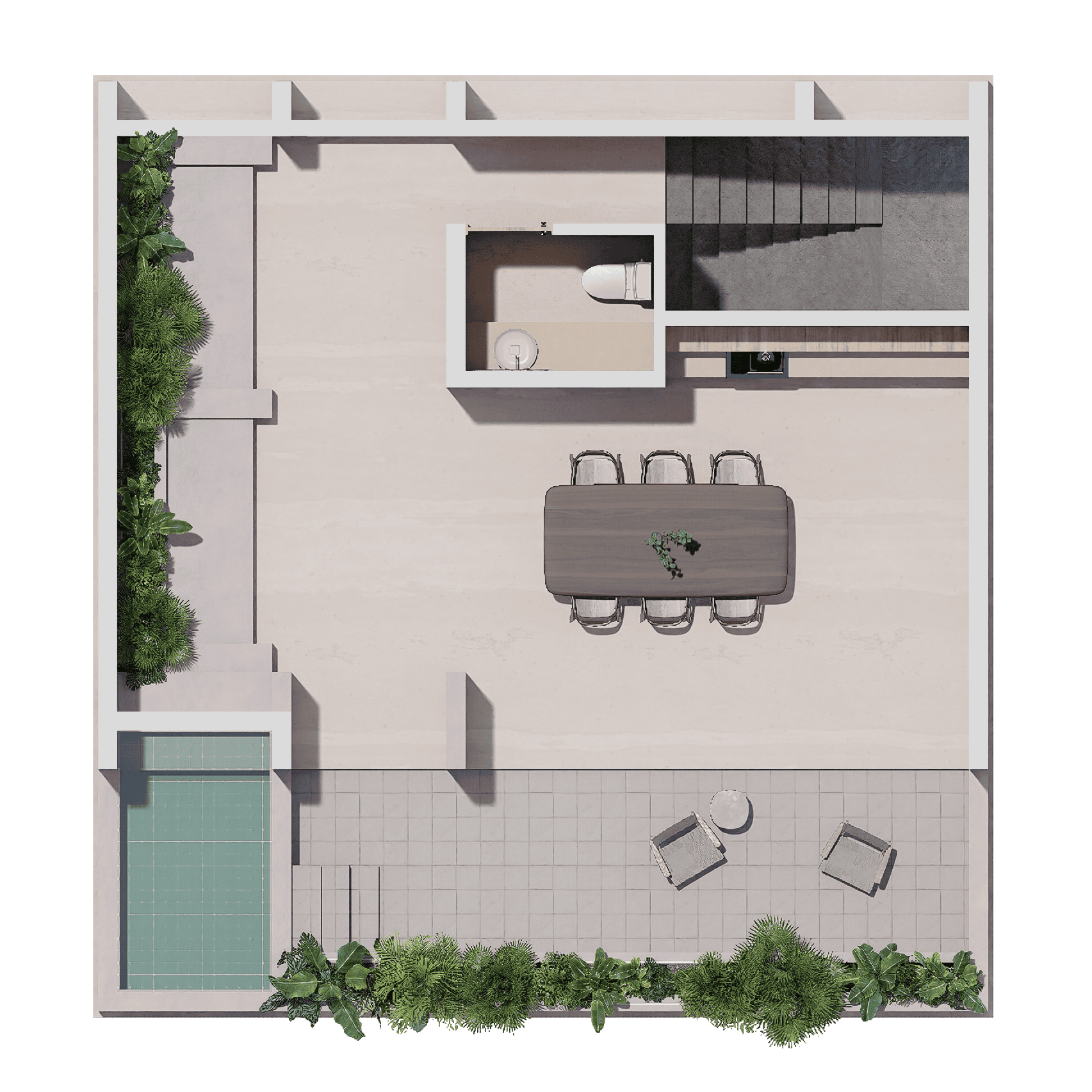 This Unit outdoor spaces make it a true gem. The private terrace offers a cozy spot to enjoy morning coffee or evening breezes, while two deep pools add an oasis-like feel for cooling off on warm Sayulita days. Topping it all off, the roof terrace features a BBQ area, creating the perfect setup for social gatherings with panoramic views over Sayulita’s lush landscape and colorful sunsets.